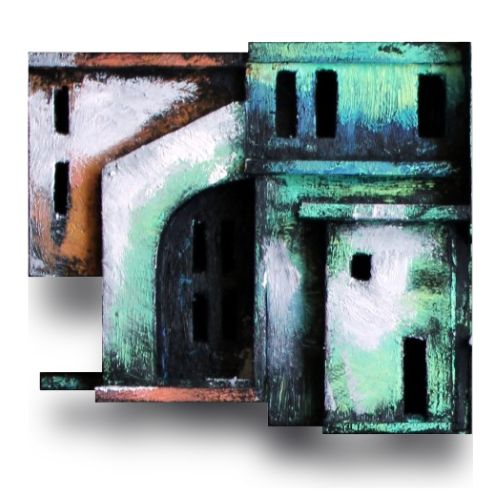 Made of wood and cardboard, with oil paint, on a black background measuring 900 x 600 mm.