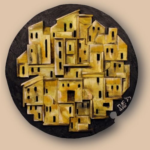 Construction en bois, avec des peintures à l’huile, sur un fond circulaire noir, de format 500 x 500 mm.