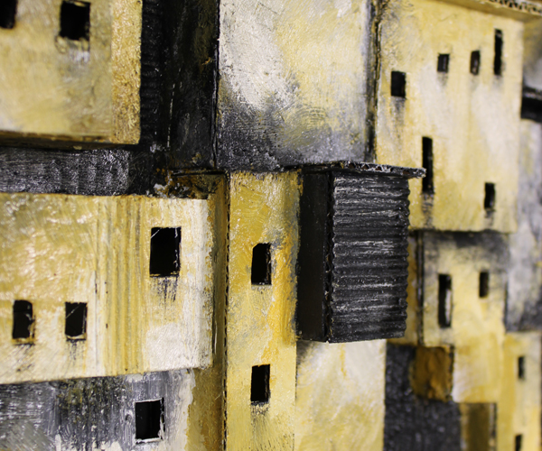 Construction en carton, avec des peintures à l’huile, sur un fond noir de format 1200 x 800 mm.