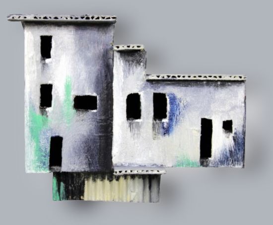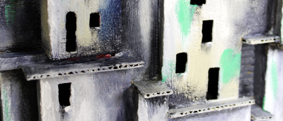 A construction of cardboard, with oil paints on a black background measuring 900 x 600 mm.